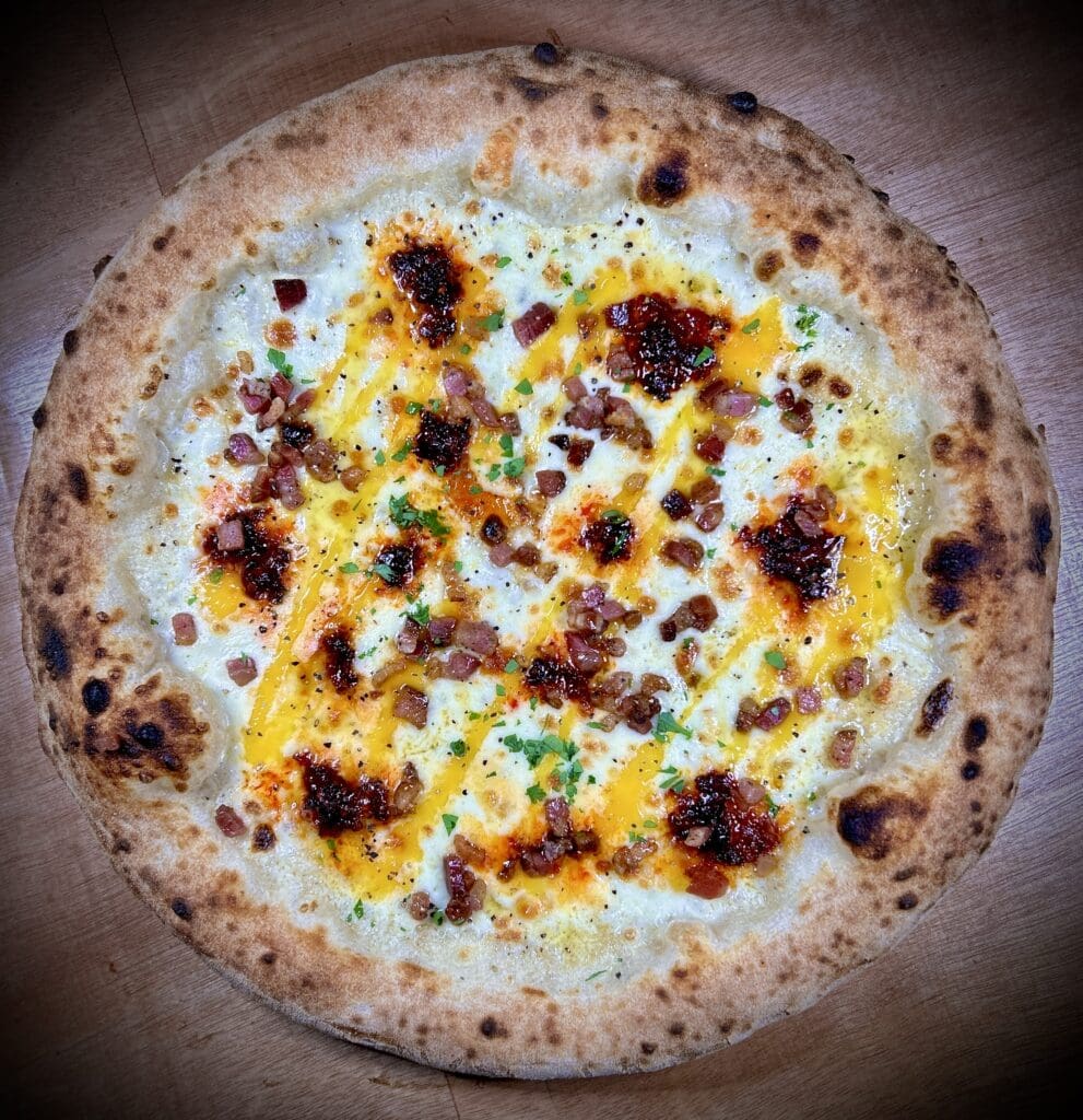 White Base, Crispy Guanciale (Tuscan Pork Cheek), Egg Yolk, Mozzarella, Nduja Sausage Meat, Parmesan, Black Pepper