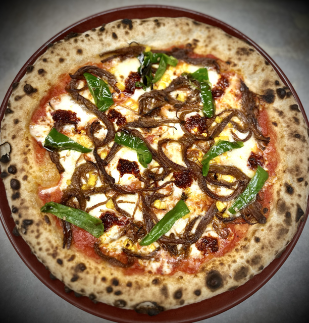 House Tomato Sauce, Smokey BBQ Beef brisket, Charred Corn, Nduja Sausage, Buffalo Mozzarella, Padron Peppers